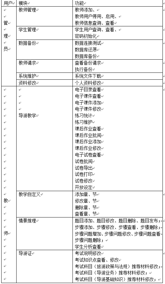 系(xi)統采用(yong)管理員—教(jiao)師—學生的用(yong)戶(hu)(hu)管理模(mo)式,由三(san)種權(quan)限用(yong)戶(hu)(hu),各權(quan)限用(yong)戶(hu)(hu)功能不同。