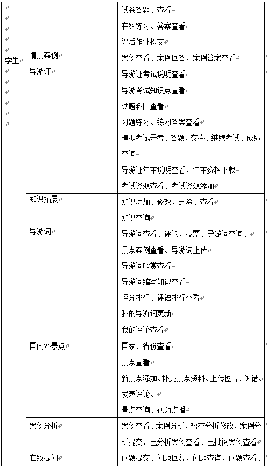學(xue)(xue)生的(de)主要功能是導(dao)游教學(xue)(xue)知(zhi)(zhi)識(shi)的(de)學(xue)(xue)習(xi)(xi)、完成(cheng)情景推理(li)中包含(han)的(de)案例及(ji)題目(mu)、導(dao)游證考試(shi)學(xue)(xue)習(xi)(xi)及(ji)模擬考試(shi)、導(dao)游拓展(zhan)知(zhi)(zhi)識(shi)學(xue)(xue)習(xi)(xi),同(tong)時可(ke)添加新的(de)知(zhi)(zhi)識(shi)供其(qi)他同(tong)學(xue)(xue)學(xue)(xue)習(xi)(xi)、導(dao)游詞學(xue)(xue)習(xi)(xi)并(bing)編(bian)寫導(dao)游詞、國內外景點(dian)學(xue)(xue)習(xi)(xi)、案例分析和在線提問。