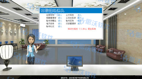 思沃文秘虛擬(ni)仿真實(shi)訓系統是(shi)我公司依據文秘專(zhuan)業(ye)相(xiang)關(guan)課(ke)程,結合3D動(dong)態場景技術,引入(ru)實(shi)際文秘工作中的(de)相(xiang)關(guan)案例,融合開發的(de)一款(kuan)針對(dui)文秘專(zhuan)業(ye)實(shi)訓的(de)應用型(xing)教(jiao)學平(ping)臺軟件。